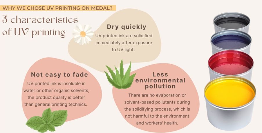 UV-tulostus tarjoaa erinomaisia etuja räätälöidyille metallimitaleille. Muste kovettuu välittömästi UV-valon alla, mikä takaa nopean tuotannon ilman tahroja. Sen korkea kestävyys vettä ja liuottimia vastaan tarkoittaa, että suunnitelmasi pysyvät eloisina ja pitkäikäisinä—kauas parempina kuin perinteiset painomenetelmät. Lisäksi UV-tulostus on ympäristötietoinen valinta. Ilman liuottimen haihtumista tai haitallisia päästöjä kovettumisprosessin aikana se on turvallisempaa sekä ympäristölle että tuotantohenkilöstölle. Niille, jotka arvostavat sekä laatua että kestävyyttä, UV-tulostetut mitalit ovat ihanteellinen ratkaisu.